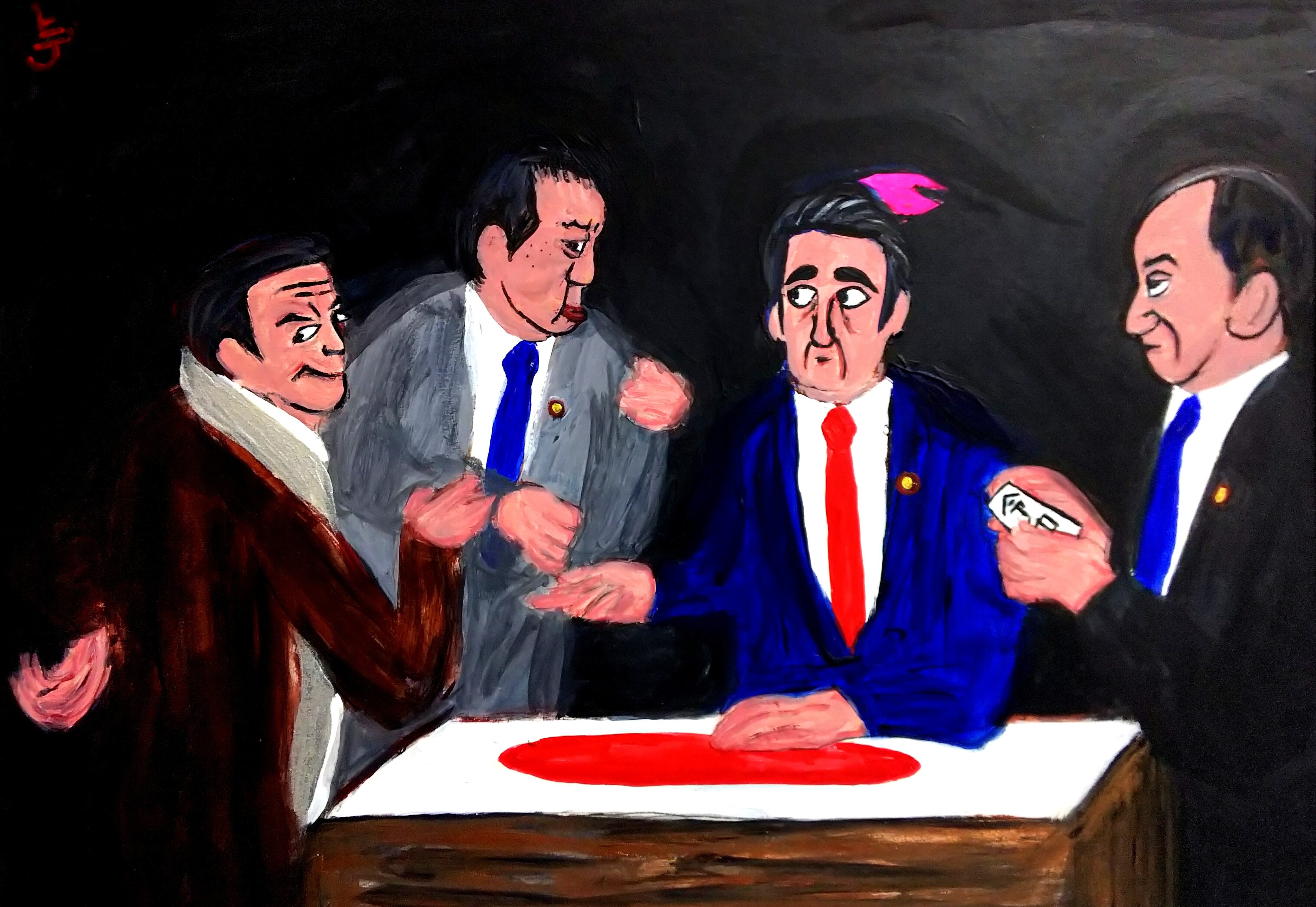 左からアソウさんらしき人、そしてニカイさん、アベさんは頭に桜の花びらがついていることに気づいてません。一番右は、スガさん。令和のカードをみつめ、「令和おじさん」として人気を集めた過去にすがっているのかもしれません。