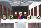 レオナルド・ダ・ヴィンチ《最後の晩餐》のパロディ画。