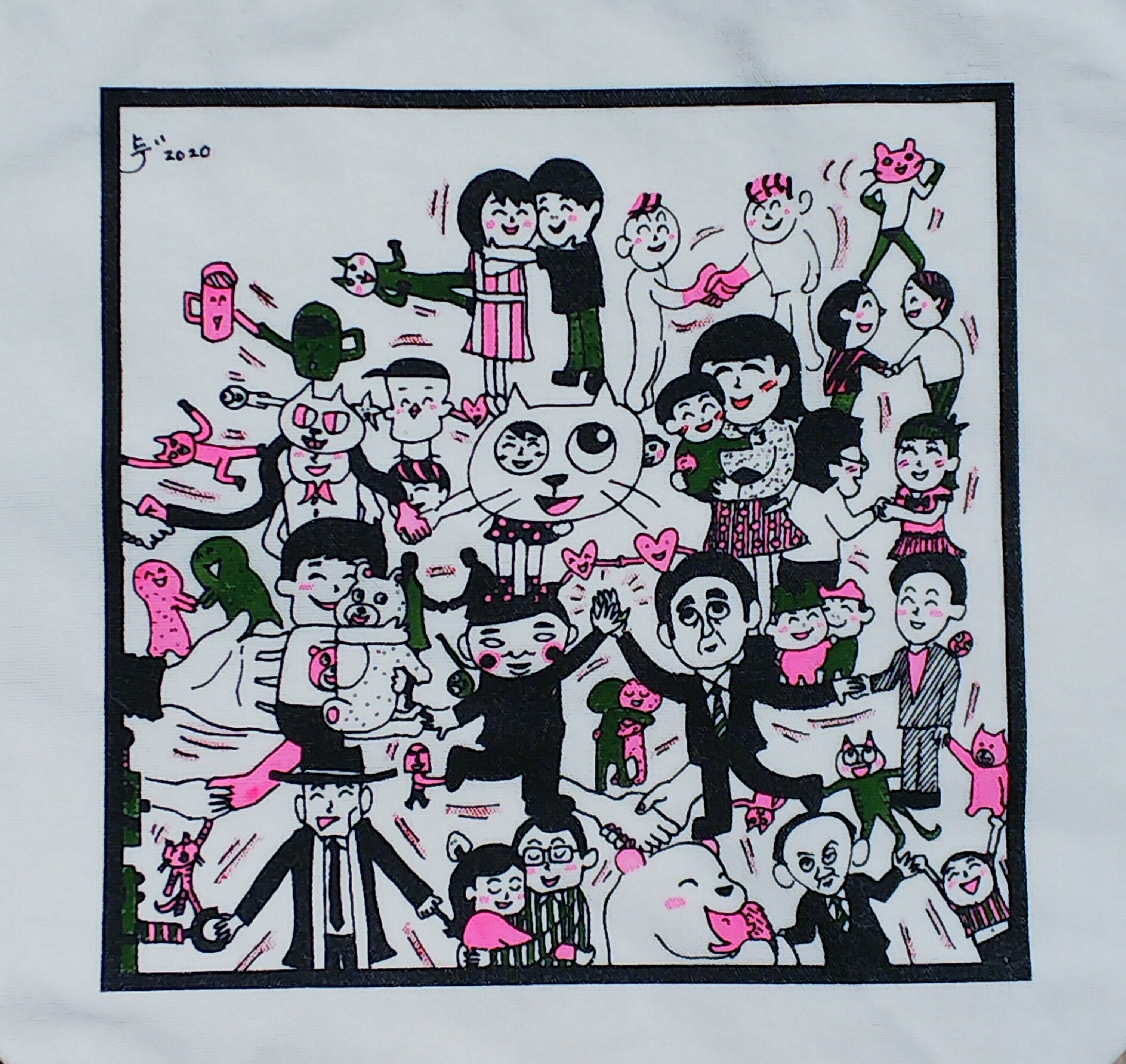 新型コロナが早く終息し、自由に握手して、ハイタッチして、ハグする。そんな密着できる世の中が、早く戻ってくることを祈って描いた作品です。