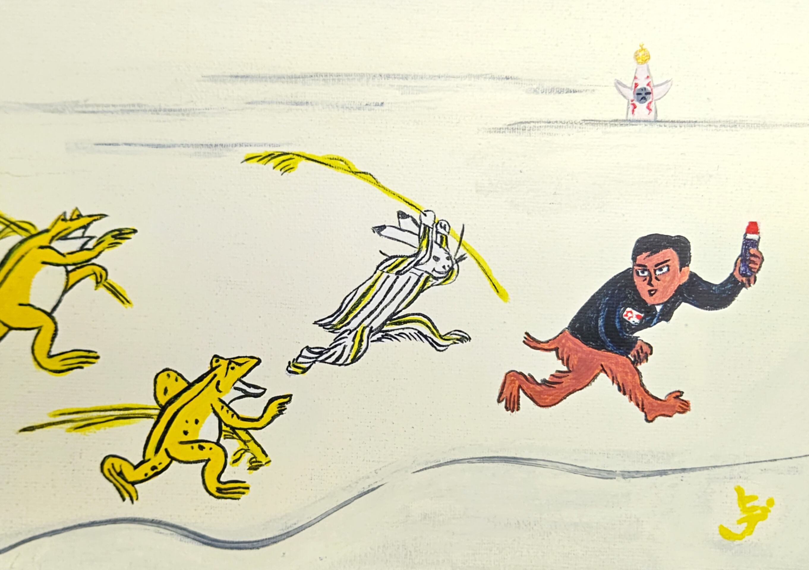 浪花らしく黄色のカエルたちに、縞模様のウサギ。逃げる吉村知事の手には、イソジンが握られています。