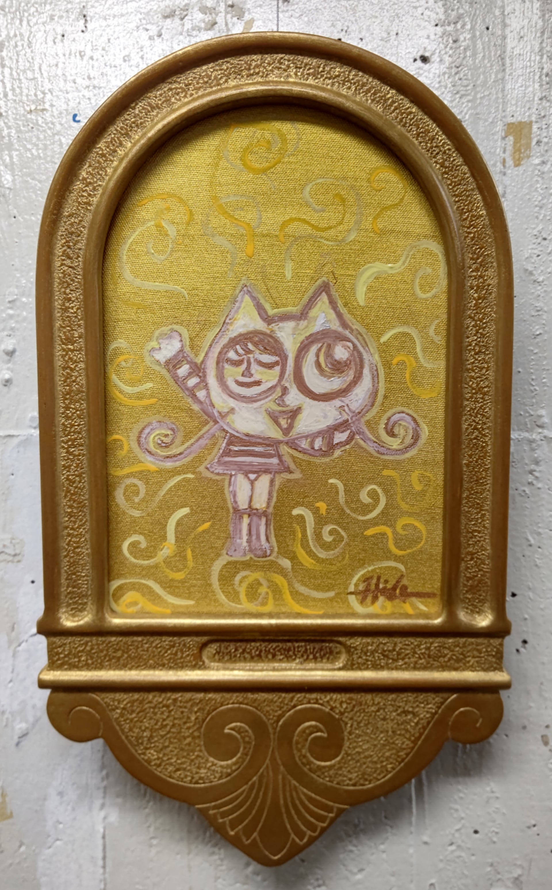文字通り猫をかぶってますが、右目の部分から顔を出しているので、どうにもバランスが悪いです。スカートからパンツが見えているのは、頭隠して尻隠さずの状態です。