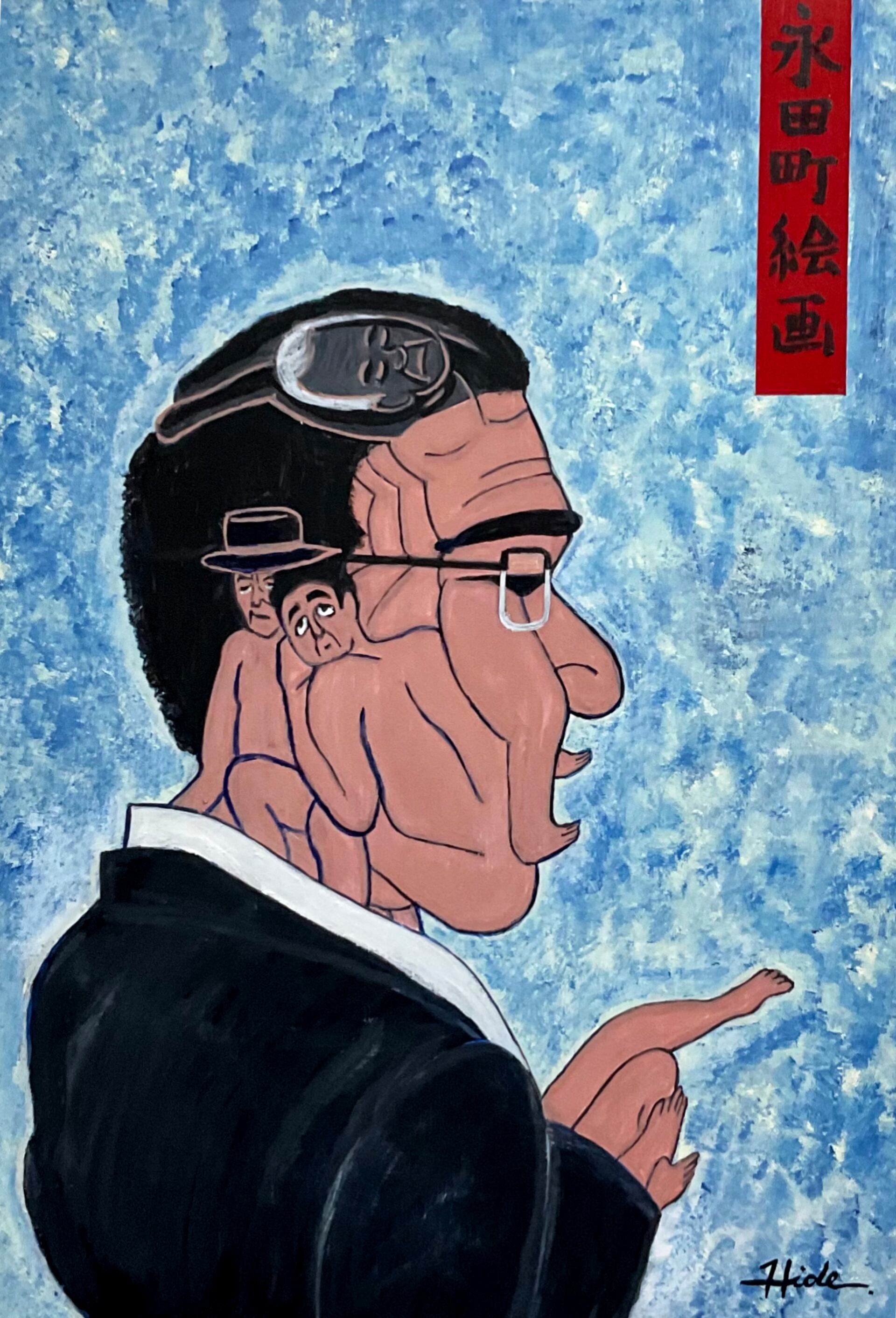 福本ヒデの《3Aかたまってキシダになる》は、3人のAが固まってキシダ首相になっています。アマリさんが矢面に立って、アベさん、アソウさんは寄り添って隠れているようにも見えます。